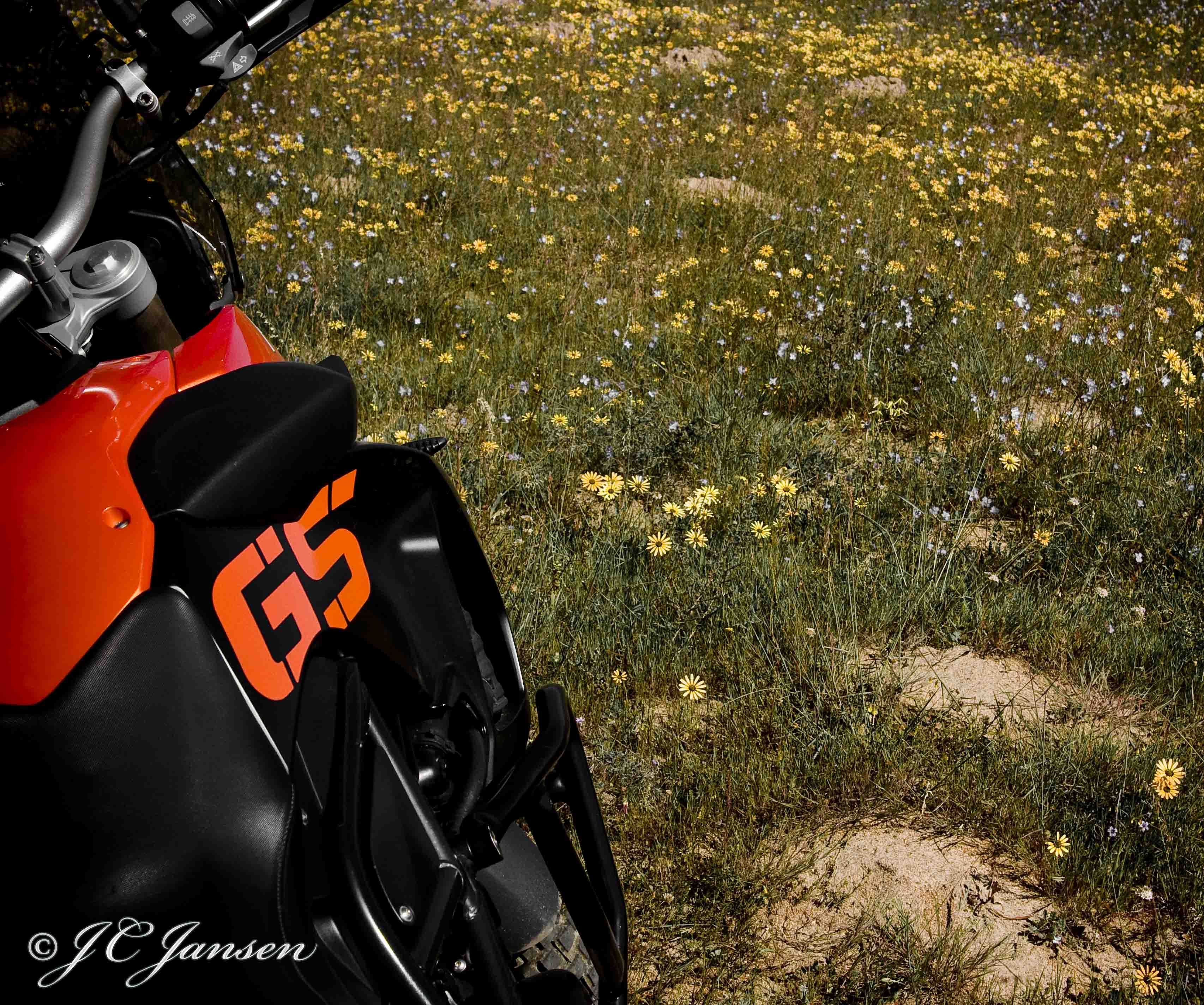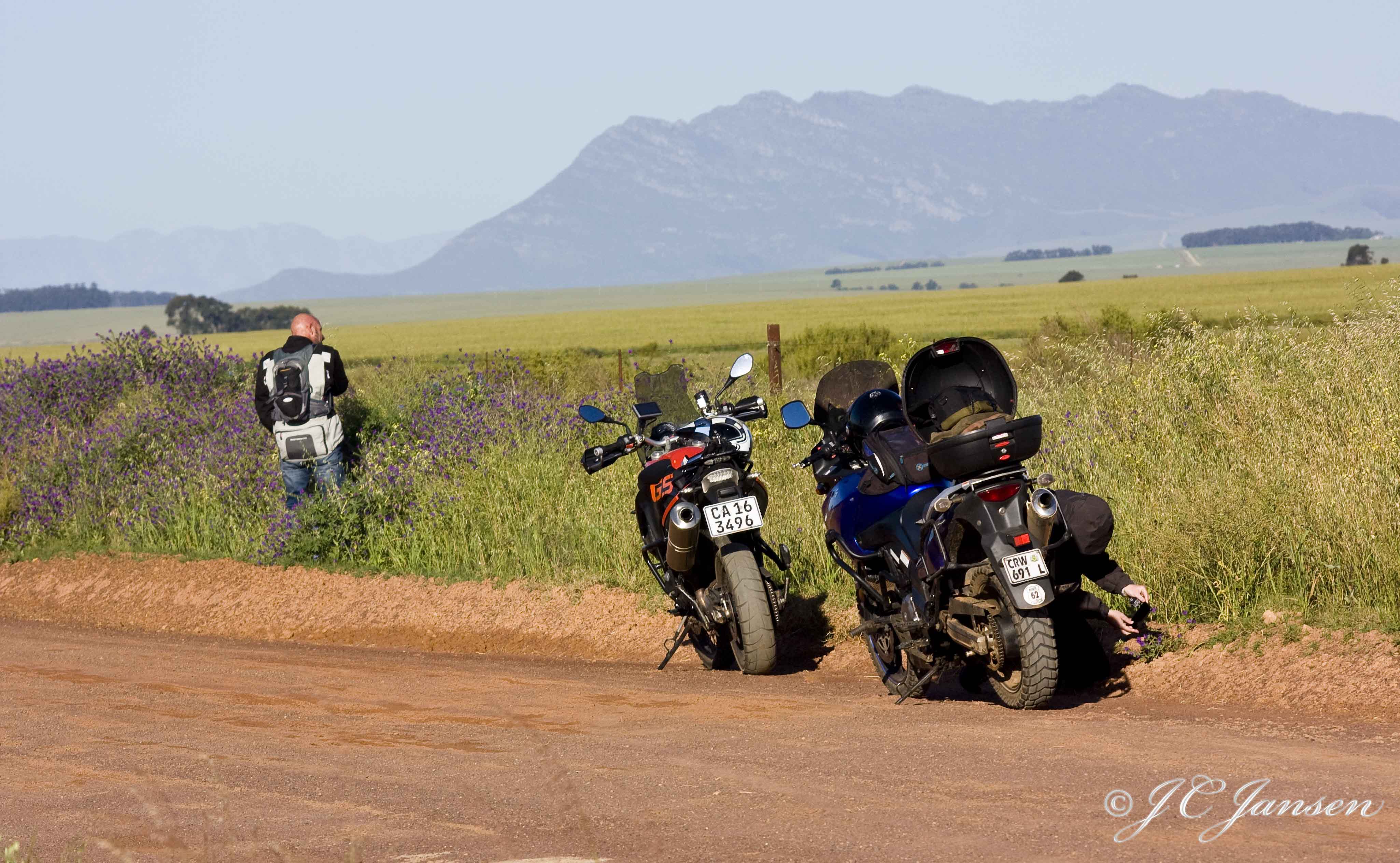 The best way to experience the open road is on a motorbike. You feel and see the details of nature. This past weekend was all about bikes, gravel roads, flowers and friends. Our friend Suné suggested that we go to Darling on Saturday as they have the flower show. The flower show was not our highest priority, but we didn’t need much convincing to take the bikes and ride. We took the N7 North and then the R27. At the sign to the Groote Post wine estate, we took the dirt road to the farm. It’s 10 km’s on this well maintained gravel road before one reaches the farm. I currently have a knobbly on the front wheel of my BMW, but the standard issue back wheel. The back wheel will get a knobbly in the next two weeks which I’m really looking forward to. The back wheel has no grip and as a result I took it relatively easy. Stoof on the other hand has knobblies and clings to the road and Christoff always has fun off-road.