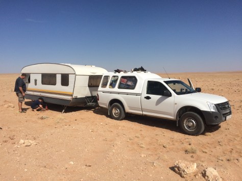 We turned back and when we got to the rest of the party we found out the axle of the caravan bent and as a result the one tire bit through the floor of the caravan and started biting into the fridge that was standing atop of that area. The caravan was no longer road worthy. By the time we got there most of the stuff was already packed out of the caravan onto the trailer and into the Landy and bakkie. The decision was already made to leave the caravan in desert. We assisted to strip down he caravan and left not a lot behind. The carcass and curtains was probably all that was left.
